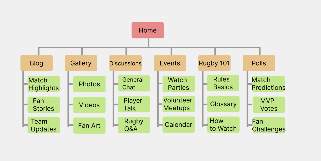 A clear structure with main sections such as Blog, Gallery, Discussions, Events, Rugby 101, and Polls ensures users can easily access contentContent prioritization on the home page