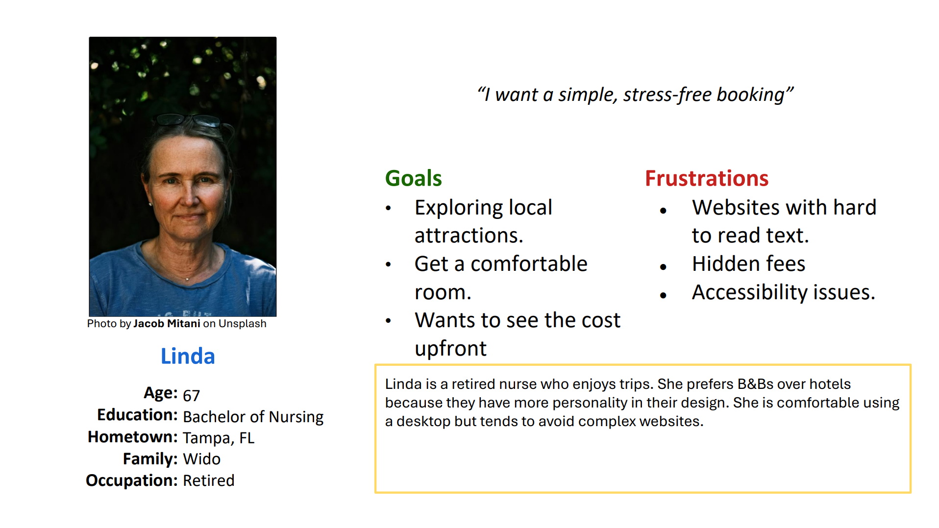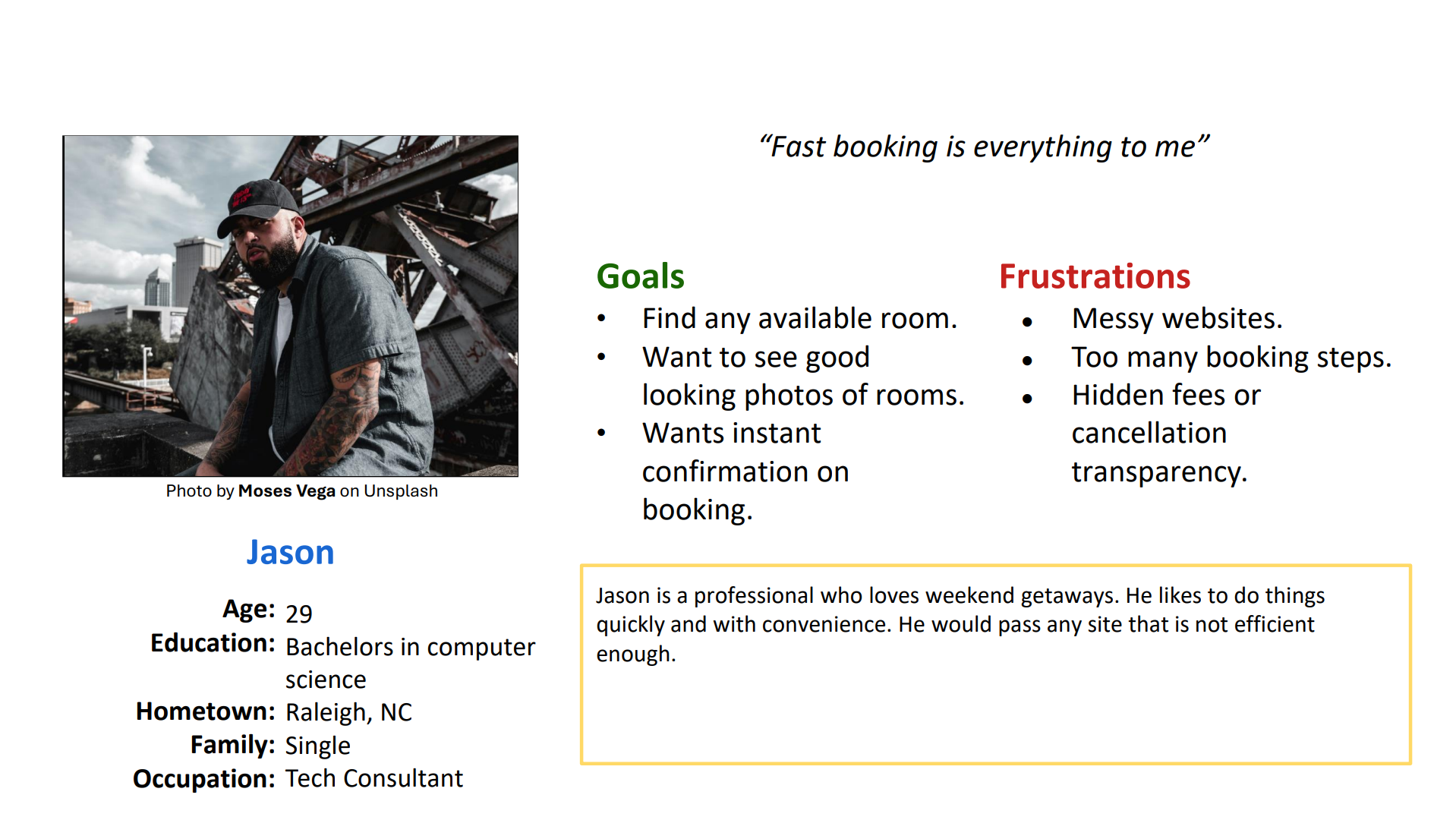 Some users (Jason) want fast booking, while others (Linda) need reassurance and detailed informationIndustry standard = clarity + filtering + trust signals